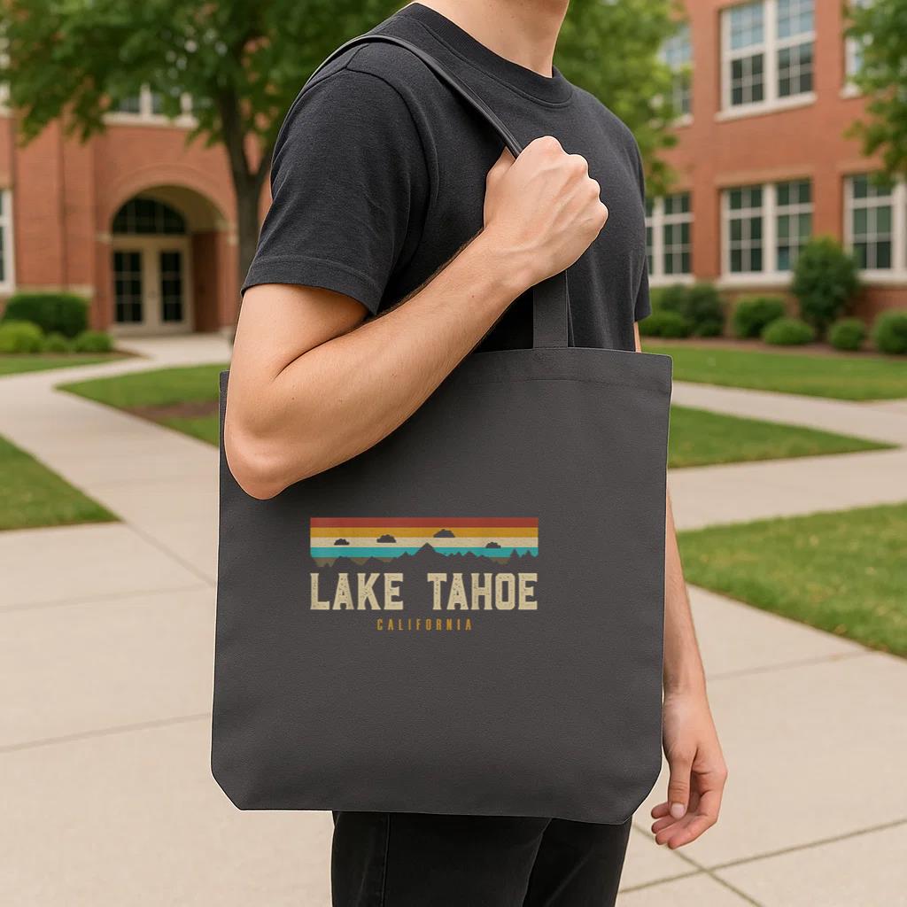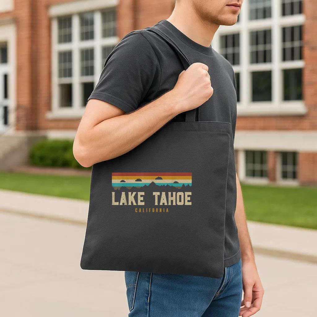 Chic, durable, and reusable, this Lake Tahoe Vintage Mountains Hiking Camping California Tote Canvas Bag canvas tote bag is your daily go-to or a thoughtful gift for any occasion.